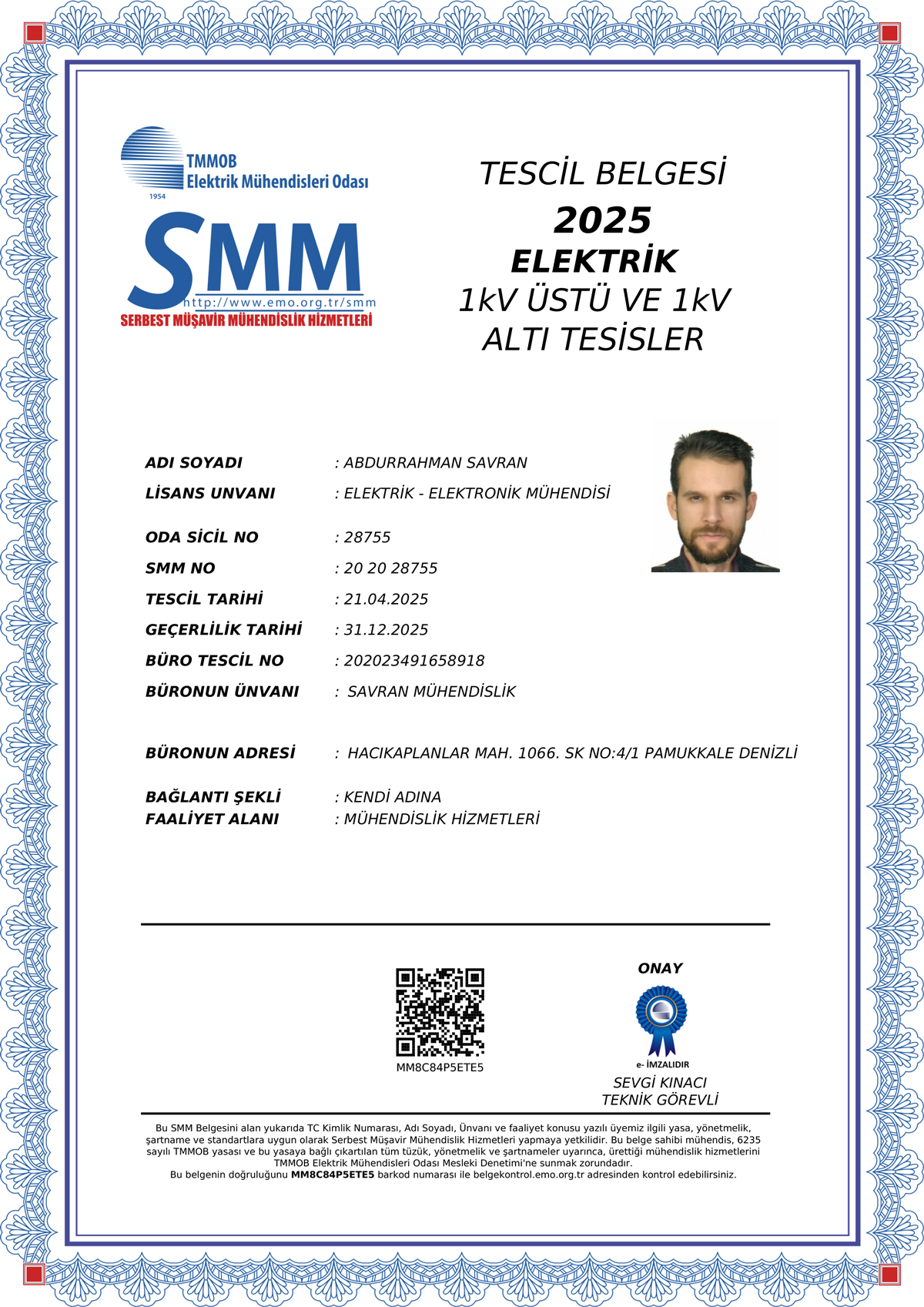 Serbest Müşavir Mühendis (SMM) yetkimizle, elektrik taahhüt ve projelendirme hizmetlerinin yanı sıra; Topraklama Ölçümü, Elektrik İç Tesisat Kontrolü, Yıldırımdan Korunma ve Kompanzasyon gibi kritik alanlarda hassas ölçümleme ve geçerli raporlama hizmetleri sunuyoruz. Tesisinizin mevcut durumunu analiz ediyor, riskleri ortadan kaldırıyor ve verimliliği artırıyoruz.